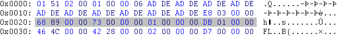 | 0x0010 | E8 03 00 00 | E8 » E8 hex = 232 dez » 232 × 256º = 232 × 1 = 232 03 » 03 hex = 3 dez » 3 × 256¹ = 3 × 256 = 768 00 » 00 hex = 0 dez » 0 × 256² = 0 × 65536 = 0 00 » 00 hex = 0 dez » 0 × 256³ = 0 × 16777216 = 0 232 + 768 + 0 + 0 = 1000 | This file contains 1000 packages with informations. |