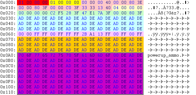 | 00 00 A0 40 | 5.000000 | unknown red ammo clip min; it seems (I'm pretty sure) that this complete part belongs to the inventory parts above; (note for me: empty blocks above maybe space for the canceled nci powerup) |